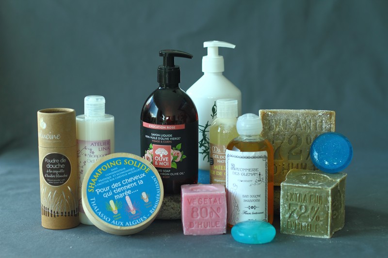 Savon, douche, pousse-mousse, shampoings.